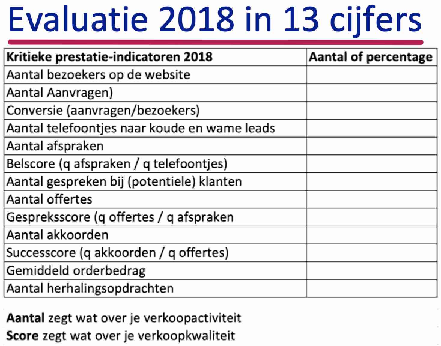 Ben je tevreden over je omzet van 2018? Of had het wel wat meer mogen zijn? Ligt dat dan aan je ACTIVITEIT of aan de KWALITEIT van je verkoopinspanningen? En wil je dat in 2019 anders zien? Evalueer eens wat er in het afgelopen jaar beter had kunnen gaan. Dan weet je wat je komend jaar anders moet doen! Evalueer niet met een lang verhaal. Evalueer in cijfers. Vul het schema van de foto van deze post in, dan weet wat je moet veranderen. Ben je ontevreden over de uitkomsten en je wilt hulp om de aantallen of de scores omhoog te krijgen? Of ben je tevreden, maar wil je meer? Neem dan contact met me op.